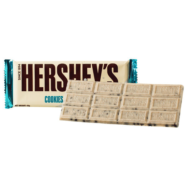 Ein beliebter Klassiker aus den USA: zart-schmelzende weiße Schokolade von Hershey's mit knusprigen Schokokeks-Stückchen für den extra Crunch
